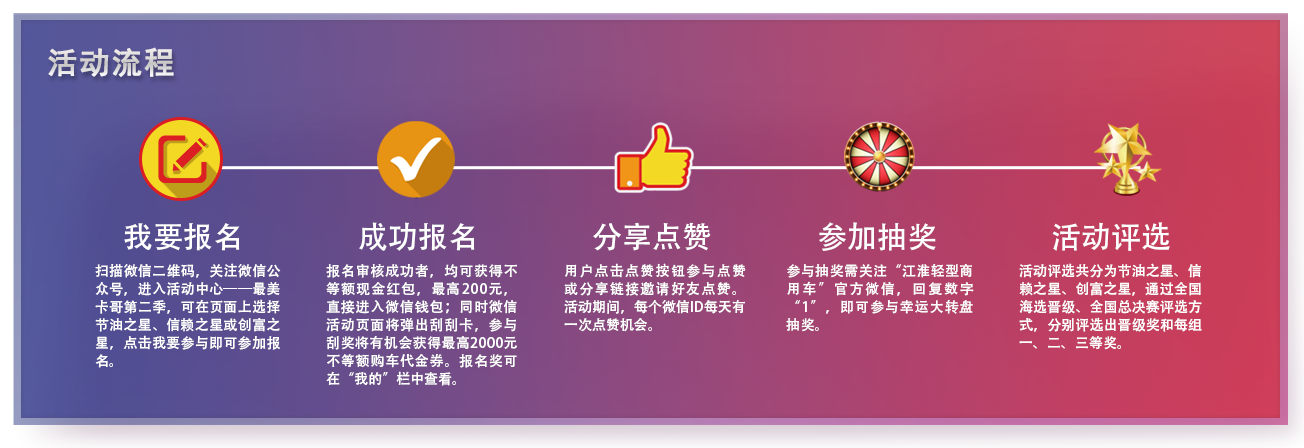 全国海选晋级赛规则:以分组点赞数(800以上)+分享内容精彩性综合评定,每组60名优胜者进入全国总决赛评选。参赛选手,需通过指定服务站对提报里程数进行核实。